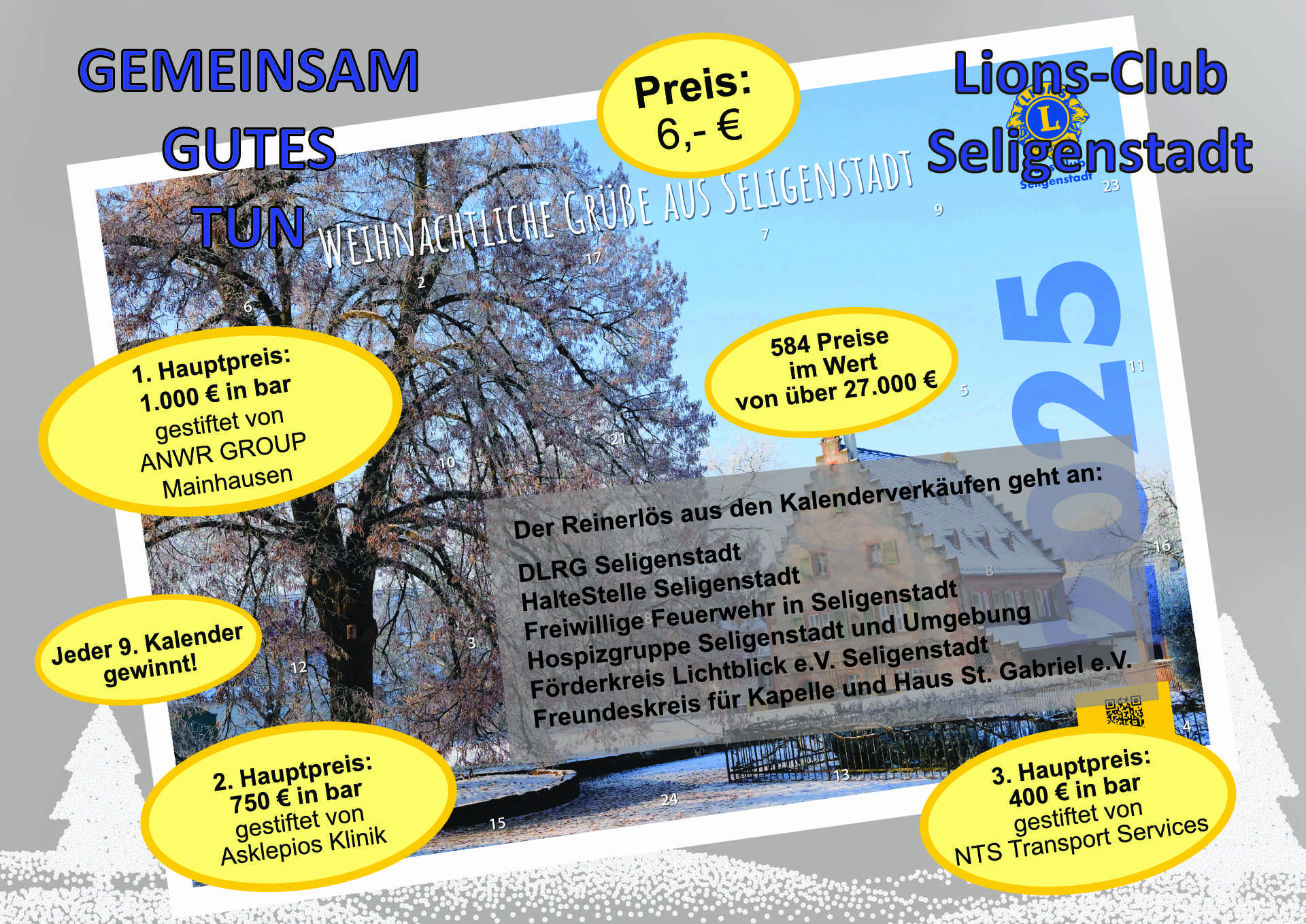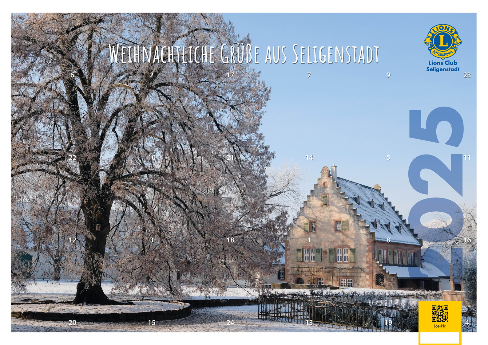 Am Samstag, den 25. Oktober, beginnt auf dem Marktplatz in Seligenstadt der Verkauf des diesjährigen Lions-Adventskalenders. Bürgermeister Daniell Bastian verkauft an diesem Tag zwischen 10 und 13 Uhr gemeinsam mit Mitgliedern des Lions-Clubs Seligenstadt die ersten Kalender vor dem Rathaus. Sie werden noch bis zum 29. November bei zahlreichen Geschäftsleuten, Apotheken und Arztpraxen in der Region erhältlich sein.